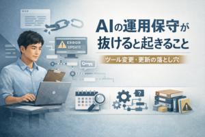 AIの運用保守が抜けると起きること:ツール変更・更新の落とし穴 2026年3月12日 | AI AI活用を始めたのに継続が不安…その原因は「運用保守」の抜けかもしれません。AIの運用保守が抜けると起きることを、ツール変更・更新の落とし穴と外注・内製の分担から整理し、止まらない運用の型を紹介します。