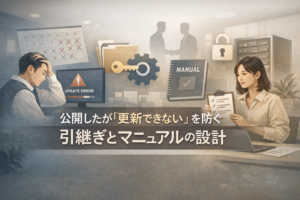 ホームページ制作で公開したが更新できない…を防ぐには、引継ぎとマニュアルの設計が欠かせません。担当交代が多いと「操作不明で更新停止」が起きがちです。本記事では、権限・手順・資産を一本化する引継ぎ台帳と、読まれなくても機能するマニュアルの作り方を解説します。